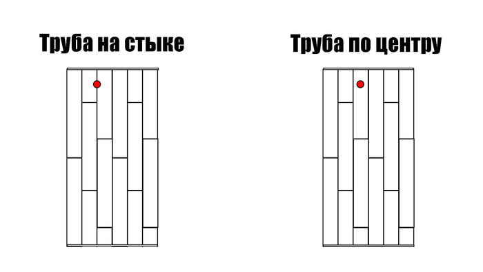 В случае с трубами и ламинатом у нас может быть 2 варианта стыковки. В первой ситуации замки ламината попадают непосредственно на трубу. Во втором — труба попадает на цельную плашку.
