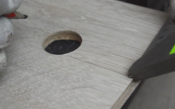 1. С помощью угольника и карандаша переносим центр трубы на плашку ламината, затем высверливаем отверстие, которое будет больше диаметра трубы примерно на 10 мм. Это необходимо для того, чтобы соблюсти технологический зазор.