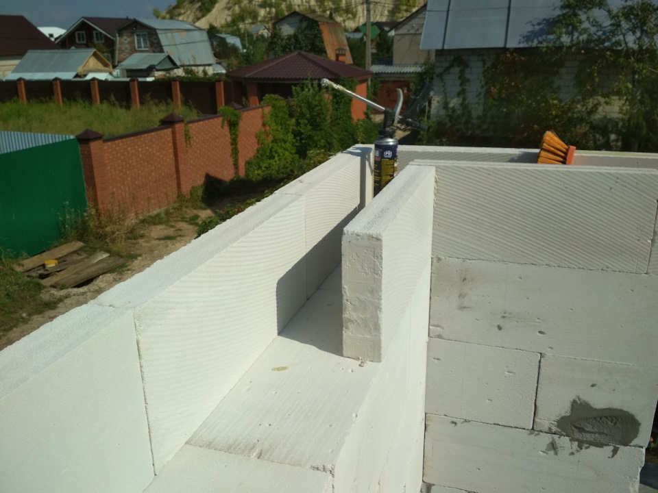 Ну а дальше все просто : блоки легкие, я из них буквально за день выкладываю желоб над 10 рядом кладки. Клал блоки на клей-пену.